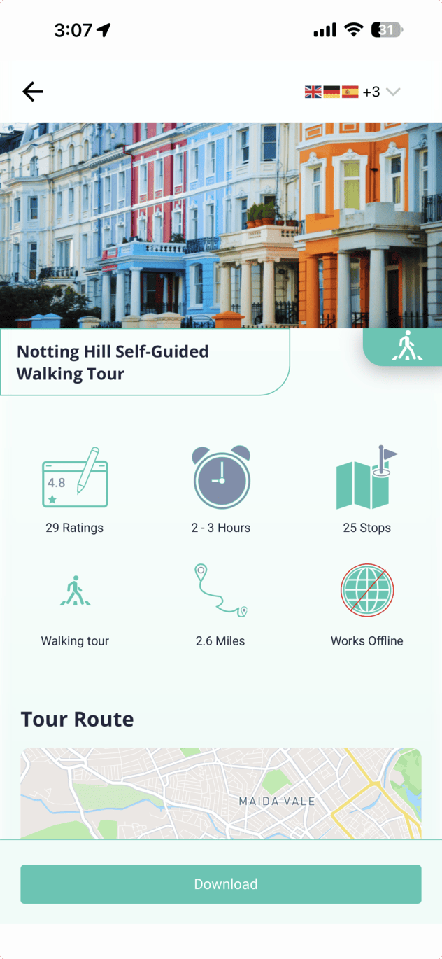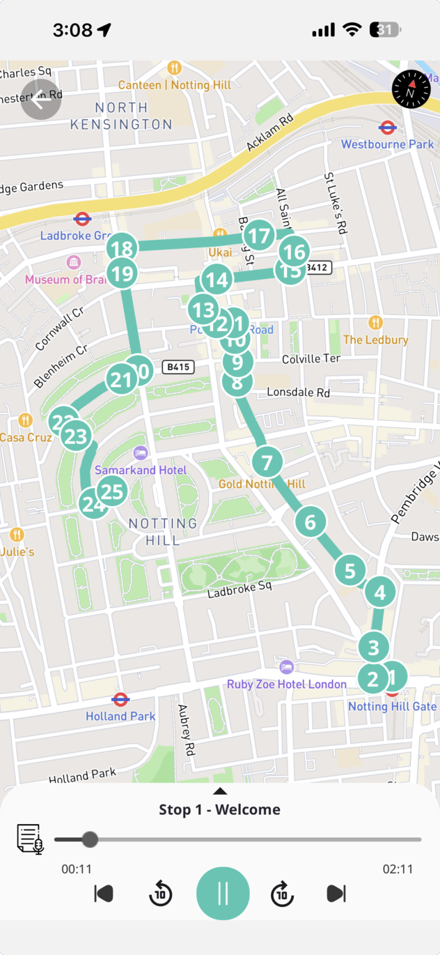 Download your chosen tour to your phone. No internet needed — works completely offline.